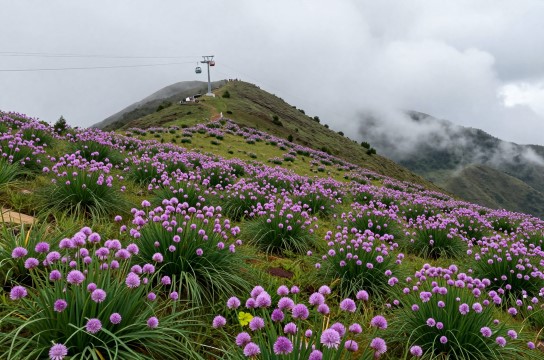 想象一下,你坐在通往大韭菜坪山顶的索道缆车内,往外面望去,是磅礴起伏的莽莽群山。而在这群山之间,泛着紫光的野韭菜花随风摇曳,就好像在和你打招呼。还有那轻歌曼舞的云海薄雾,时而遮住花海,时而又露出一角,仿佛在和你玩捉迷藏。游客们手里拿着宣传册,诵读着“云里梦里,我在韭菜坪等你”这样的句子,此情此景,谁能不向往呢?