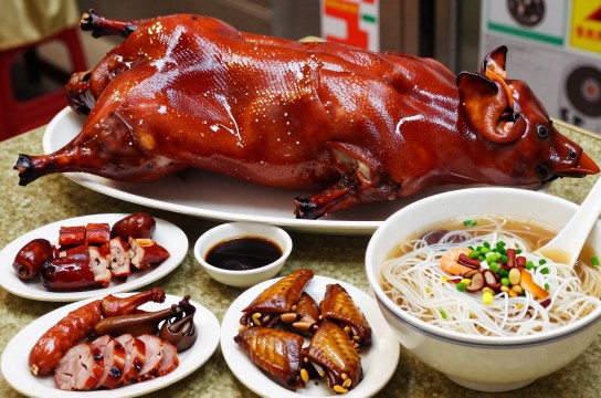 烧腊在香港及广东一带盛行,和他们的习俗有关。香港人喜图吉利,每逢年过节上香拜神都会带上乳猪烧腊,电影开镜也喜切乳猪图吉利。所以港式烧腊一直经久不衰。要是你去香港,可一定要尝尝这地道的香港烧腊,保证让你大饱口福。